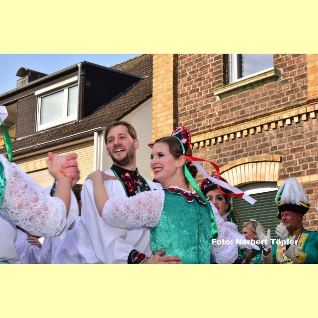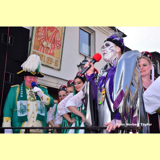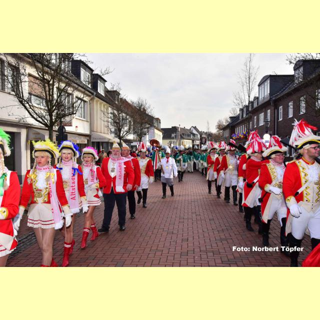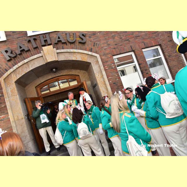 Altweiber 2019 in Monheim Marsch vom Rathaus zum Doll Eck und Auftritt der Marienburg-Garde